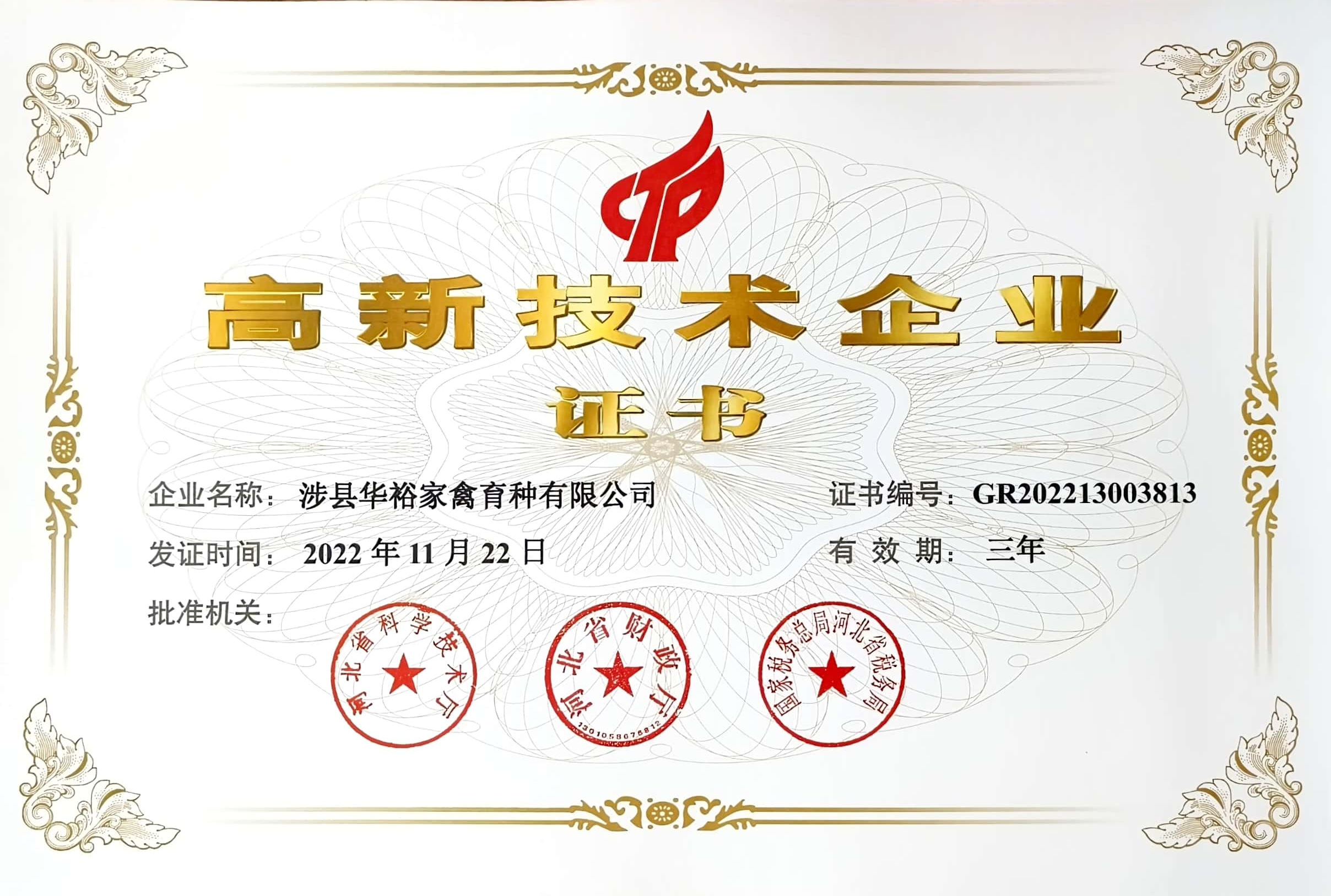 喜報|涉縣華裕家禽育種有限公司榮獲“高新技術企業” 稱號